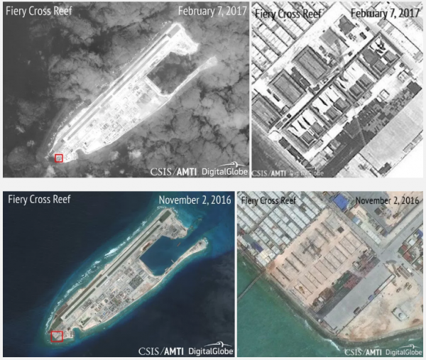 永暑岛2017年2月和2016年11月的卫星全景图和局部放大图 公卫星地图画面显示,这种放置地对空导弹的建筑出现在美济、渚碧和永署等三个南海人工岛礁上。AMTI是美国战略和国际研究中心的下属机构。 AMTI在报告中说,在南沙群岛最大的三个人造岛屿:美济、渚碧和永署上正在建造部署地对空导弹的建筑。每一个岛上有八个相同尺寸的建筑,每个建筑长 20米宽10米。一名不愿意透露姓名的情报人员向路透社透露,这些混凝土建筑的屋顶是可开启的,这使得防空导弹运载车辆可以在不暴露自身的情况下直接在建 筑内发射导弹,中国已经在永兴岛上部署的红旗-9防空系统被认为将在未来部署到这三个岛屿上。 作者:佚名 来源:不详
