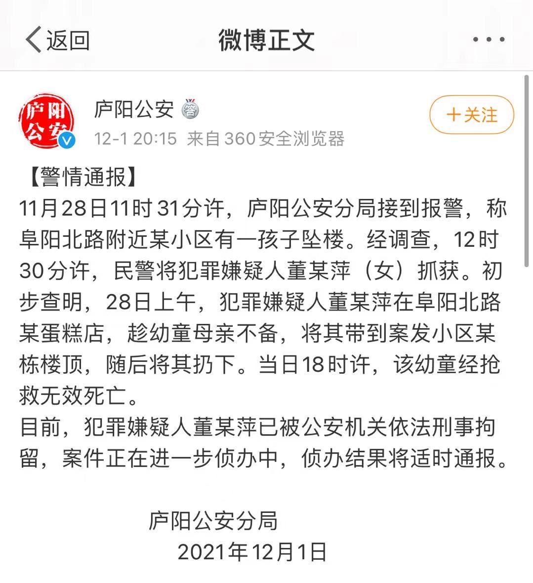 12月1日晚8点多,合肥市庐阳区公安分局也是发布警情通报,通报称:11月28日11时31分许,合肥市庐阳公安分局接到报警,称阜阳北路附近某小区有一孩子坠楼。经调查,当日12时30分许,民警将犯罪嫌疑人董某萍(女)抓获。初步查明,28日上午,犯罪嫌疑人董某萍在阜阳北路某蛋糕店,趁幼童母亲不备,将其带到案发小区某栋楼顶,随后将其扔下。当日18时许,该幼童经抢救无效死亡。