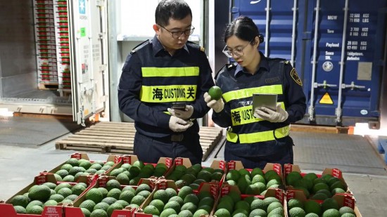图为上海海关关员对中国首批自南非进口的牛油果进行现场查验。(上海海关供图)