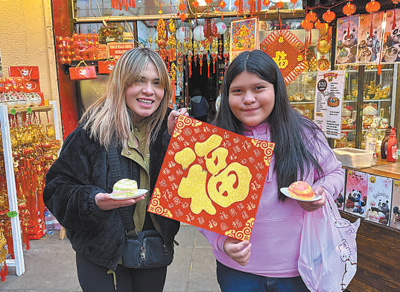 临近蛇年春节,位于墨西哥首都墨西哥城的唐人街节日氛围浓厚。图为两名女孩在中国产品超市展示福字。 本报墨西哥分社 ?埃内斯托·多明戈斯摄 |