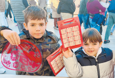 1月19日,在西班牙阿利坎特2025蛇年春节庙会上,小朋友们收集中国生肖印章并兑换新春福字窗花。 本报西班牙分社??苏珊娜摄 |