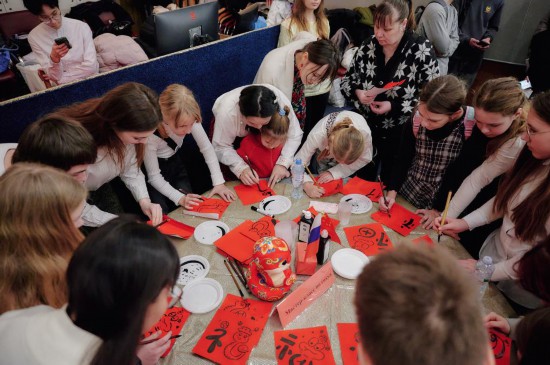 2月3日,俄罗斯圣彼得堡学生在中小学春节联欢节上表演。新华社发(莫京娜摄) 除了文艺表演,联欢节还设置了丰富多彩的文化体验环节。孩子们或执笔书写福字,或体验剪纸、拓印等传统技艺,亲身感受中华文化的独特魅力。 “写毛笔字虽然有点难,但很有趣。”当地中学生伊万一边展示自己写的福字,一边笑着说道,“中国文化充满智慧和美感,希望有一天我能成为一个‘中国通’。”