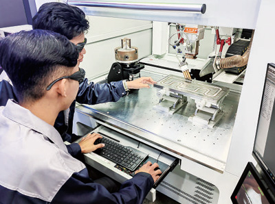 由南京工业职业技术大学与柬埔寨柬华理事总会合作共建的柬华应用科技大学,是中柬职业教育交流合作的重要成果。图为该校学生正在进行现代焊接技术的实操学习。 查伊霍克摄 |