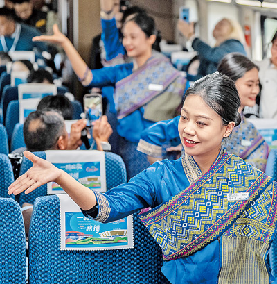 跨国动车 共享一路欢歌 本报记者 杨文明 本报通讯员 王一翔 2月5日上午10时,云南西双版纳站里人头攒动。候车厅的一角,传来一阵悠扬的旋律。拨动琴弦的是来自法国的画家、音乐家乔纳森·苏维。用吉他打卡旅行地,用画笔记录风景,这是乔纳森的习惯。 乔纳森的妻子是湖南人,他们有两个可爱的孩子。2015年,一家人定居大理。云南美丽的山水风光、闲适的田园生活,是乔纳森艺术创作的灵感源泉。 这个春节假期,乔纳森精心规划了一趟采风之旅——乘坐火车一路向南,先在西双版纳感受热带雨林风光,再继续搭乘中老铁路列车跨越国境开启老挝游。 在西双版纳,乔纳森一家在热带雨林中徒步探险,感受大自然神奇魅力;走进傣族村落,体验独特节日文化……“森林里弥漫着湿润的气息,仿佛每一片叶子都在尽情呼吸,一切都焕发着生机与活力。”乔纳森对热带雨林情有独钟,这里独特的生态系统、丰富多样的动植物让他深深着迷。 下一站,乔纳森一家的目的地是老挝琅勃拉邦。乘坐中老铁路国际旅客列车进行跨国旅行,如今是一种热门旅行方式。早晨从昆明出发,9个多小时后就能抵达老挝首都万象。自2021年12月开通运营以来,中老铁路已开行超过1500列国际旅客列车,服务了来自100多个国家和地区的40多万名旅客。 11时24分,D87次列车缓缓驶入西双版纳站,乔纳森一家登上列车。 列车沿着蜿蜒的铁路线前行,沿途地势变化多样,时而穿行在山洞之中,时而飞驰在高架桥之上。车上举行了中老铁路春节文化主题活动,歌曲、舞蹈、变脸等节目纷纷上演,一路上喝彩声、欢笑声不断。“车厢变成了一个流动的舞台,精彩的节目让人大饱眼福!”乔纳森说。 午饭时间,列车上供应傣味小排、酸笋牛肉、菠萝饭等特色餐食。乔纳森点了一杯“一路咖香”现磨咖啡,这款咖啡融合了云南和老挝的经典咖啡豆,在列车上非常受欢迎。不多时,咖啡香味便弥漫了整个车厢。 茂密的热带雨林、连绵的山脉、宁静的村庄……乔纳森掏出速写本,记录着窗外的风景变幻。列车经过橄榄坝澜沧江大桥,这里视野开阔,澜沧江穿桥而过,许多乘客拿出手机拍照。孩子们对大桥充满好奇,有乘客讲述起大桥的故事:这个地段土壤松散,建桥很困难,以前河两边的人民互通往来只能靠渡船。是大桥的修建,改变了那段历史…… 说话间,火车就要抵达边境口岸磨憨站了。列车工作人员开始帮助乘客填写出境信息登记卡,为通关做准备。12时31分,列车抵达。乔纳森一家带着行李下车,按照指示牌指引,进入出境联检区域办理手续。整个过程高效快捷,1个小时左右,他们便重新回到车上。列车再次启程,十来分钟后抵达老挝磨丁站。在这里,乔纳森一家办完入境手续,等待开启下一段旅程。“这么方便就跨境了!”乔纳森不禁感慨。