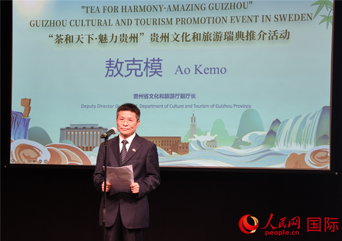 贵州省文化和旅游厅副厅长敖克模致辞。人民网记者 殷淼摄 贵州省文化和旅游厅副厅长敖克模在致辞中表示:“贵州不仅是中国重要的茶叶产区,更是世界自然与文化遗产的宝库。我们热忱欢迎瑞典朋友到贵州品茗赏景,亲身体验多彩的民族文化。” 作者:佚名 来源:不详