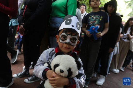 6月29日,在墨西哥首都墨西哥城查普特佩克动物园,游客拿着大熊猫玩偶参加“欣欣”的生日庆祝活动。新华社记者 李梦馨 摄