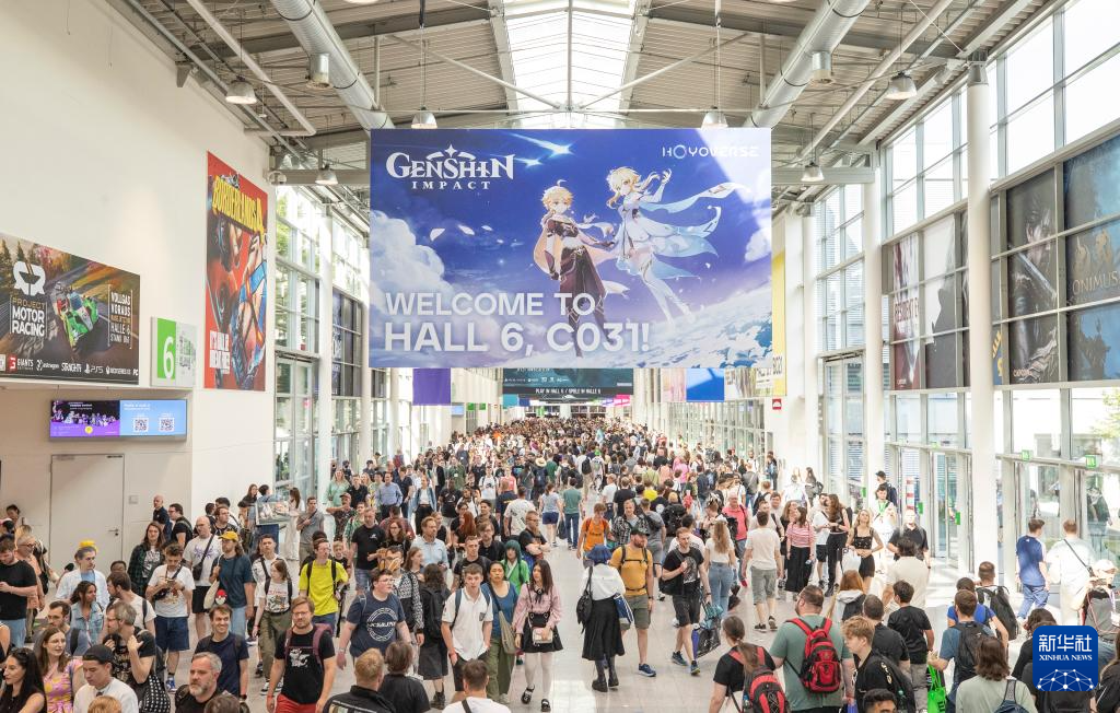 8月21日,在德国科隆,参观者在科隆游戏展走过游戏《原神》海报。