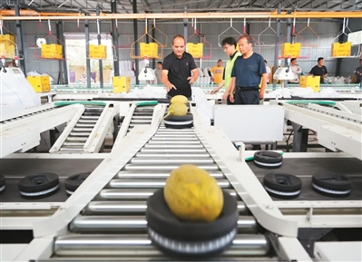 哈密市伊州区花园乡哈密瓜分选中心智能分选设备正在运行。 克依木·卡德尔摄