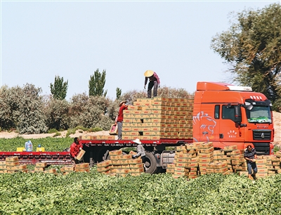 新疆维吾尔自治区哈密市伊州区南湖乡,农民在装运哈密瓜。 曹新加摄