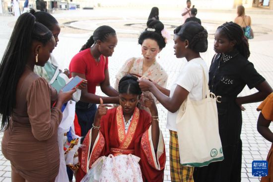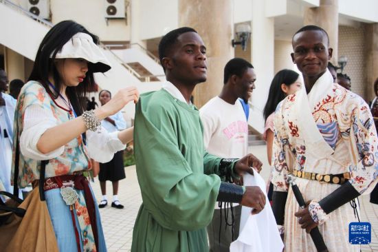 11月8日,在贝宁经济首都科托努举行的“中国贝宁服装秀”活动中,阿波美卡拉维大学孔子学院学生在穿戴中国传统服饰。新华社发(塞拉芬摄) 贝宁文化推广人埃策希尔·多洪格说,设计师们的作品展示了“时尚是一种能够连接不同文化、丰富身份认同的通用语言”,让贝中两国民众在欣赏美的同时,体验文化多样性的魅力。