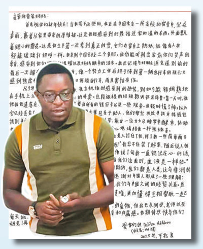 亲爱的爸爸妈妈: 首先祝你们新年快乐!当我写下这些时,我正在中国北京一所高校的宿舍中,坐在桌前,外面飘着细小的雪花。这是我生平第一次看到真正的雪,它们在窗台上跳动,就像有人在轻敲玻璃打招呼一样。 我来到中国已经三个多月了。我仍能记得出发前你们的笑声和温暖的拥抱,以及妈妈眼中的泪水。我还记得与好朋友迈克道别前的最后一次握手。我既充满兴奋,又感到焦虑和害怕。 在中国生活的短短几个月里,从我手攥着机票走出北京机场时感受到的恐慌,到如今能够娴熟地在手机上点一份香辣牛肉面汤的外卖,这段旅程的经验教训弥足珍贵。 第一天时,我把钱包遗落在北京机场,里面装着我所有的银行卡以及一些现金。我顿时慌了神。然而,中国的工作人员非常友善且乐于助人,他们帮忙四处寻找并将钱包找到交还给了我。我于凌晨3点抵达中国人民大学,前台一位女士协助我办理了入住手续,并在将我的信息录入系统时,贴心地端给我一杯热绿茶。 有一次我去商场,一位老人对我说:“我们外表看起来或许有所不同,但我们本质是一样的。”这与非洲的理念十分契合。非洲人与中国人是兄弟和朋友,我们与中国之间的经贸关系,是建立在互惠互利的基础上的,我们都曾遭受相似的苦难,更加懂得互相帮助、一起进步。 爸爸妈妈,我十分思念你们和家乡,但我也从同学、老师以及每天遇到的那些人身上感受到了家的温暖和归属感。我期待尽快与你们相见!再次祝你们新年快乐! 爱你们的达利索·恩德洛武 信件背后 这是赞比亚青年达利索·恩德洛武(中文名:林靖)写给父母的一封信。他曾在赞比亚大学系统学习经济学、中文及语言学,2025年9月进入中国人民大学丝路学院,攻读当代中国研究专业。这是他第一次来到中国。在校期间,在学院“核心竞争力课程+社会实践”培养模式下,他系统学习中国文化、深刻理解中国发展道路、发展模式及发展经验,还到中国多地开展社会实践,深入了解中国的发展变化。 (本报记者彭训文采访整理)