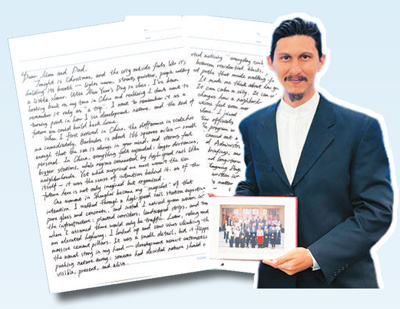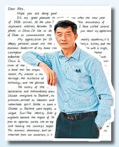亲爱的亚历克斯: 展信佳! 值此2026年到来之际,我高兴地给你写下这封信。2025年是泰中建交50周年,我有幸在这一年到访中国多个城市,想与你这位好友分享我对中国文化与创新发展的感受。 我对中国文化的认同,源于我的家族历史。约120年前,我的祖父从广东漂洋过海到泰国谋生。早年来自广东、福建等地的移民,生活清贫却意志不屈。他们普遍融入泰国社会,数代之后,华人后裔已成为泰国经济的重要部分。这份基于创业精神与勤勉品格的经济贡献,巩固了泰中紧密联系,也使华人文化成为泰国社会不可或缺的重要力量。中华文化及其精神特质令我敬仰。尤其是广东文化传统,至今仍在我家族中延续,中国文化中蕴藏的韧性,让我深受触动。 如今,中国的科技发展同样令我赞叹。它已不仅是制造中心,更在关键的前沿领域引领全球,以创新助力世界市场发展。中国在锂离子电池、太阳能组件等绿色科技领域的重要进展,对全球低碳转型至关重要。以人工智能为代表的高科技产业快速发展,更让中国站上数字革命前沿。这一切源于国家的巨大投入与坚定决心,也为中国未来提升全球影响力注入动力。 最后不得不提的是中国无与伦比的美食多样性。中国美食是一幅融合各地风土人情的画卷。广东的清淡鲜美、四川的麻辣鲜香、山东的醇厚咸鲜、北方面食的朴实温暖……其丰富程度令人惊叹。这正如中国的缩影:在统一的文化脉络中,包容多样、生机勃勃。 总之,泰中关系如同一棵常青树,既因历代华人的贡献而枝繁叶茂,也因两国政府的持续合作而根基深厚。 普里查 信件背后 普里查是泰国皇家林业局林业对外事务处处长。2025年11月,他参加了中国政府主办的“发展中国家森林综合可持续开发暨南南合作政策部级研讨班”。 中国在推进人与自然和谐共生的现代化进程中,始终致力于推动和践行南南合作。在本次研讨班上,普里查参加了专题讲座,还赴多地考察,了解了中国森林资源保护与利用经验和生态文明建设成果,与各国学员深入交流中国绿色发展经验。 (本报记者王慧琼翻译整理) 作者:佚名 来源:不详