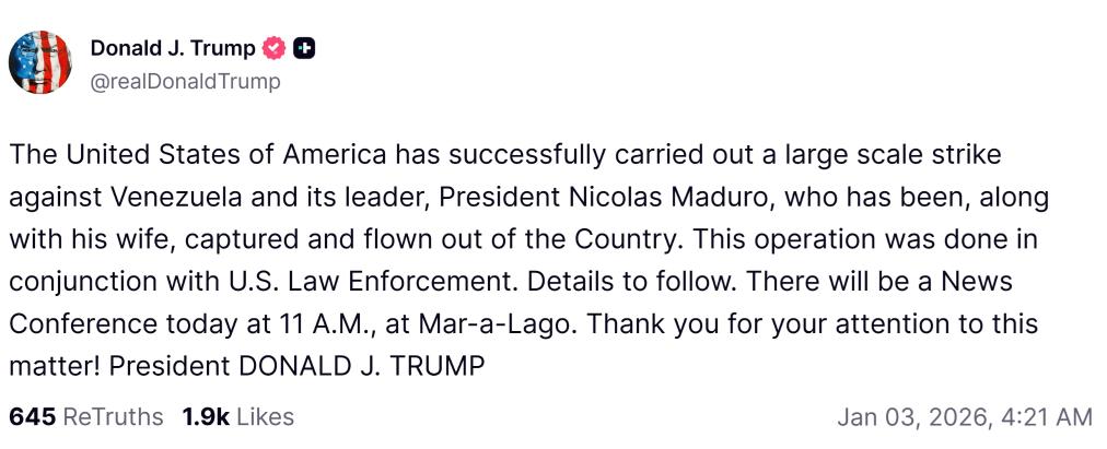 美国总统特朗普社交媒体X帖文。 新华社北京1月3日电 美国总统特朗普美国东部时间3日凌晨4时许在社交媒体发文称,美方已对委内瑞拉实施打击,抓获委内瑞拉总统马杜罗及其夫人,并带离委内瑞拉。此时距委内瑞拉首都加拉加斯传出巨响仅过了3个多小时。 委内瑞拉时间3日2时(美国东部时间凌晨1时)左右:新华社记者在委内瑞拉首都加拉加斯听到当地上空传出多声巨响。 美国东部时间3日凌晨:美国联邦航空局以“军事活动正在进行中”为由,禁止美国商业航班进入委内瑞拉领空。 委内瑞拉3日凌晨:委内瑞拉政府发表官方公告,强烈谴责美国现政府对委内瑞拉领土和人民实施“极其严重的军事侵略”。 委内瑞拉时间3日3时左右:哥伦比亚总统佩特罗在社交媒体发文说“向全世界发出警报:委内瑞拉遭到袭击!他们正在发射导弹进行轰炸。” 委内瑞拉时间3日3:50左右:古巴国家主席迪亚斯-卡内尔在社交媒体上发文谴责美国袭击委内瑞拉的“罪行”,呼吁国际社会对此采取紧急行动。 美国东部时间3日凌晨4:21左右:特朗普在社交媒体发文称,美方已成功对委内瑞拉实施打击,抓获马杜罗及其夫人,并带离委内瑞拉。 委内瑞拉时间3日6时左右:委内瑞拉副总统德尔西·罗德里格斯通过国家电视台表示,委政府不知道总统马杜罗及其夫人现在何处,“我们要求提供他们活着的证据”。 据美国媒体3日援引消息人士的话报道:马杜罗被美军三角洲特种部队抓获。 美国东部时间3日7:25左右:美国司法部长邦迪称马杜罗将在美国受审。(记者:李子健、田睿、陈静、蒋彪、郭文迪、张伟、马骁) 作者:佚名 来源:不详
