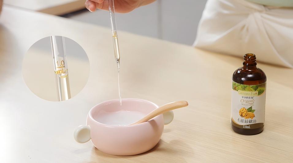 “爷爷的农场”拥有24000㎡自有生产基地,配备多个10万级净化车间、婴幼儿特殊膳食实验室与智能化高精度生产线,致力于围绕婴幼儿核心营养进行深入研究。以有机核桃油为例,品牌充分考虑婴幼儿脂肪吸收的特殊性,配方上为100%有机核桃油,亚油酸与α-亚麻酸比例约为5:1,契合《中国居民膳食指南》的科学推荐。这份不妥协的匠心,同样体现在看得见的细节上:采用避光的棕色玻璃瓶保护营养活性,设计定量装置方便精准喂养,确保宝宝摄入的每一口营养都“刚刚好”。