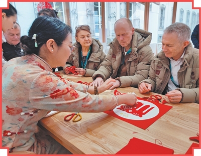 在米兰冬奥会中国之家,丹麦代表团成员体验剪纸艺术。 本报记者 谢亚宏摄
