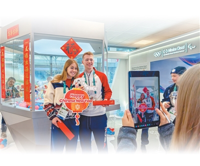 在米兰冬奥村智能徽章交换站,浓浓的中国春节元素吸引各国运动员来此拍照打卡。 环球时报记者 陈 涛摄
