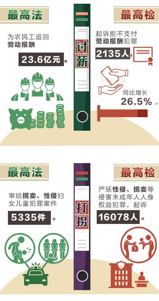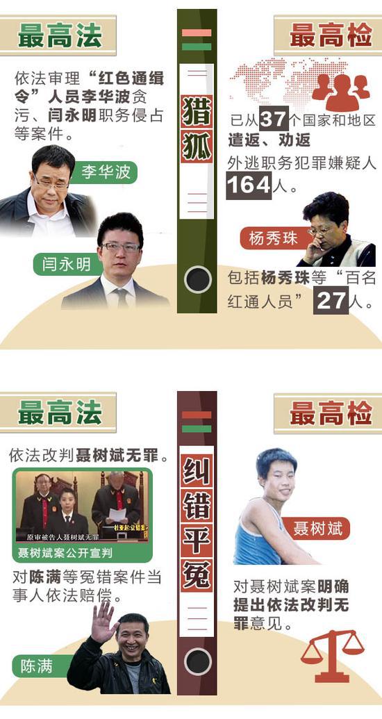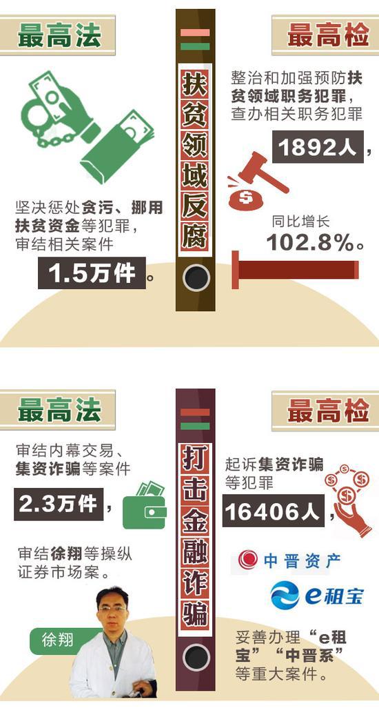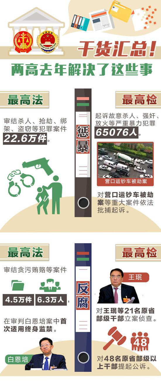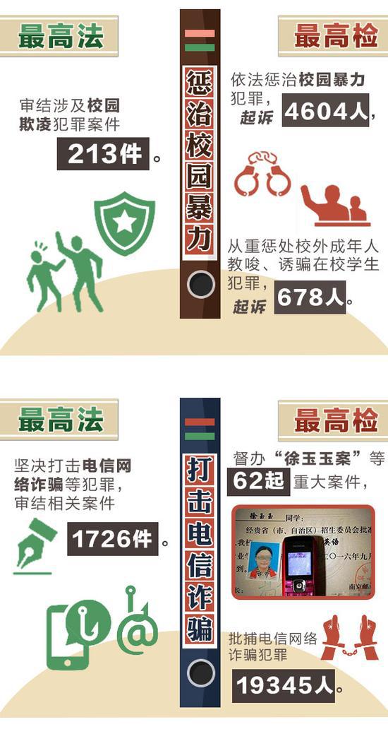 严惩暴力伤医、突出惩治“村霸”、继续亮剑电信网络诈骗、给基层干警更多保障……今年,“两高”重点要干的这八件事,与你息息相关。 ![]() 1。惩治校园暴力、伤医事件不含糊 [最高检]严惩黑恶势力、涉枪涉爆、制贩毒品、拐卖妇女儿童、制假售假、校园暴力、暴力伤医等犯罪。 近几年,校园暴力、伤医事件等频频见诸报端。人们越来越清楚地认识到,发生在校园里、医院里的暴力不仅仅是过去以为的“学生矛盾”“医患纠纷”。在这些问题上,法律不能缺席。这次,最高检明确提出要严惩校园暴力、暴力伤医等犯罪,可以想见,未来此类暴力事件将得到更好的预防和惩罚。 2。矛头对准“村霸”和宗族恶势力 [最高检]突出惩治欺压百姓、胡作非为的“村霸”和宗族恶势力犯罪。严肃查办群众身边的“小官大贪”。 去年,各级检察机关在征地拆迁等民生领域查办“蝇贪”17410人。然而,在部分农村,“村霸”和宗族恶势力并未绝迹。操纵选举、开设赌场、暴力抗法、霸占资源,他们的种种恶行让群众怨声载道。此次,最高检在往年严查群众身边腐败的基础上,将惩治矛头明确对准“村霸”和宗族恶势力,老百姓将收获更多的安全感。 3。亮剑电信网络诈骗 [最高法]依法惩治电信网络诈骗等新型违法犯罪。 [最高检]突出打击电信网络诈骗犯罪。 电信网络诈骗手段隐蔽、花样翻新,百姓防不胜防,有人被骗得倾家荡产,有人因骗局失去生命。除了筑起技术保护墙,加强个人信息保护外,整治电信网络诈骗,必须重拳出击。这次两高齐“亮剑”,无疑给参与电信网络诈骗的人很大震慑:法网恢恢,伸手必被抓! 4。非法集资将被从严惩处 [最高检]积极参与互联网金融风险专项整治,严惩非法集资等涉众型经济犯罪以及洗钱、地下钱庄、网络传销犯罪。 当下,各种金融创新层出不穷,其中的风险也越来越多。假借网贷名义诈骗、打着创新旗号集资,以高回报为诱饵,不断变换“外衣”的非法集资让很多人身陷其中。今年,最高检明确表示,严惩非法集资等涉众型经济犯罪,老百姓的钱袋子将得到更好保护。 ![]() 5。严防司法腐败“灯下黑” [最高法]坚决惩处队伍中滥用职权、贪赃枉法、以案谋私等违纪违法行为,确保公正廉洁司法。 [最高检]从严惩治司法腐败,坚决防止“灯下黑”。 司法腐败的消极影响远不止于个案,它摧残公民法律信仰,打击社会对正义的期盼,危害很大。最高法、最高检每年工作都少不了惩治司法腐败。今年最高法提出坚决惩处“滥用职权、贪赃枉法、以案谋私”,最高检提出“严格执行违法行使职权行为纠正记录通报及责任追究制度”,为全年司法领域反腐划定了重点。 6。让失信“老赖”寸步难行 [最高法]确保如期实现“用两到三年时间基本解决执行难”目标。 最高法去年“向执行难全面宣战”,承诺“用两到三年时间,基本解决执行难问题”。仅去年一年,各级法院发布失信被执行人信息689万例,限制628万人次购买机票,限制229万人次乘坐高铁。 “基本解决执行难”已经破题,最高法今年提出,加强执行规范化和信息化建设,“确保如期实现”目标,法院判决“执行难”这个老大难”问题有望得到进一步纾解。 7。重拳打击扶贫领域“蝇贪” [最高检]继续集中惩治和预防扶贫领域职务犯罪。 “贪占扶贫物资”“骗取扶贫资金”“精准扶贫识别优亲厚友”“倒卖扶贫物品获利”,抢穷人饭的扶贫“蝇贪”太招百姓恨。去年各级法院审结贪污、挪用扶贫资金等相关案件1.5万件,各级检察机关查办扶贫领域相关职务犯罪1892人。 今年最高检提出要“继续集中惩治和预防扶贫领域职务犯罪”,并表示要同发改委、扶贫办共同对“十三五”易地扶贫搬迁重点工程项目开展预防监督,实行挂牌督办,贫困群众的权益将有更坚实的保障。 ![]() 8。给基层干警更多保障支持 [最高法]关心爱护基层干警,强化履职保障。 [最高检]支持中西部地区检察人才建设。 工作繁杂压力大,没多少时间照顾家,收入待遇偏低、晋升机会较少,履行法定职责有时还会遭遇恐吓威胁、暴力抗法,这已经成为不少基层政法干警的现实写照。 如今,最高法提出“关心爱护基层干警,强化履职保障”,最高检提出“支持中西部地区检察人才建设”,两高都提出加大对边疆民族地区和革命老区等基层法院和检察院的支持帮扶力度,基层干警有望得到更多的保障和支持。 ![]() ![]() ![]() ![]() ![]() ![]()