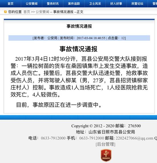 记者从日照市莒县公安局了解到,肇事车辆为一辆拉树苗的货车,目前驾驶人柳某(男,27岁,莒县招贤镇柳家庄村人)已被警方控制。事故造成1人当场死亡,1人经医院抢救无效死亡,4人轻微伤。目前,事故原因正在进一步调查中。(央视记者 李秉禅)