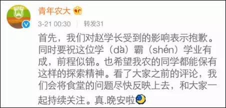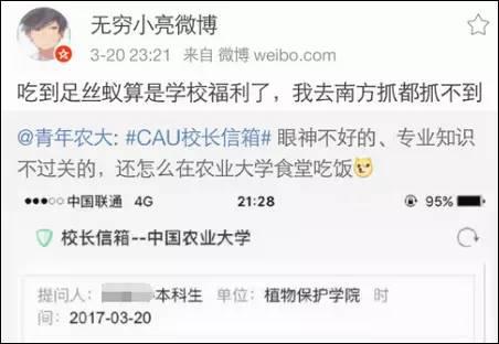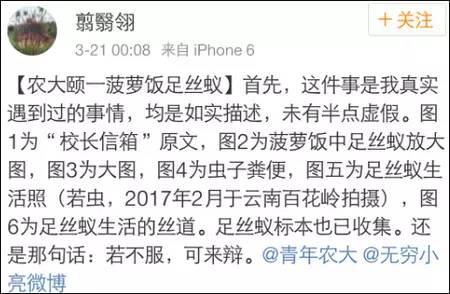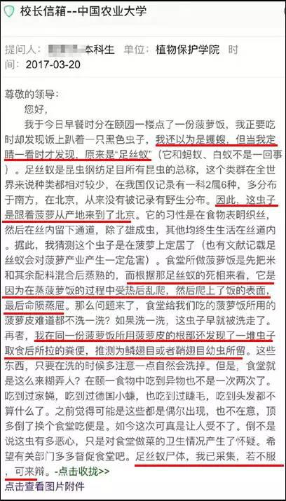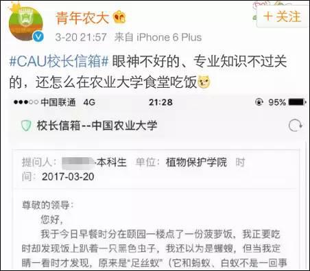 原标题:这封大学食堂投诉信火了!谁说中国学生没有科学精神? 文 观察者网 赵可心 “足丝蚁尸体,我已采集,若不服,可来辩”,中国农业大学一位本科生写给校长的信红了。 这位同学在食堂的菠萝饭中发现了虫子,于是建议有关部门督促食堂改进。谁当年还没给校长信箱写过一两封信,我怎么没火? 先来看看这封信: ![]() 厉害了,这位植物保护学院的同学不仅发现了虫子,还根据经验、文献确认其为“足丝蚁”,并根据习性等分析出菠萝饭中惊现足丝蚁的原因,不服不行。 @青年农大 迅速转发了这封有理有据、很专业的信:眼神不好的、专业知识不过关的,还怎么在农业大学食堂吃饭。 ![]() 农大校友、“博物君”张辰亮也在私人微博上调侃:“吃到足丝蚁算是学校福利了,我去南非抓都抓不到。” ![]() 围观群众很担心农业大学食堂,要养活一堆博物君,这日子没法过了。 ![]() 一个真正的吃货永远得知道自己吃的是什么,但一般人只会将饭菜中的异物统称为“虫子”…… ![]() ![]() 网友们的热情还炸出了信的原作者。 21日凌晨,他在微博声明这件事“均是如实描述,未有半点虚假”。 ![]() 他还附上“事发现场图”, ![]() ![]() 以及足丝蚁的生活照。 ![]() 知识就是力量,网友迅速将其奉为大神、学霸。 ![]() ![]() ![]() 还有向@博物杂志 力荐的。 ![]() 虽然火了,但当事人却表示:本来这只是件平平常常的事情……凑热闹的群众该散了。 整件事最应该关心其实是校园食堂的卫生管理。@青年农大 昨晚表示已向学校反映,并将持续关注。 ![]() ![]() 责任编辑:李伟山 作者:佚名 来源:不详