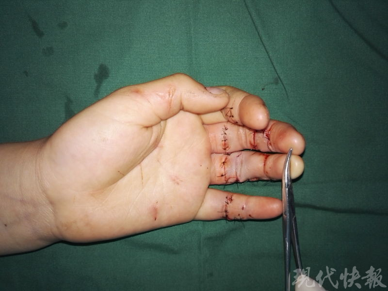 经医生诊断,男孩面部有9处伤口,其中两处贯通面颊至口腔,造成舌头断裂。左手除了大拇指,其它均有伤口,肌腱和血管神经损伤,皮肤软组织撕脱。