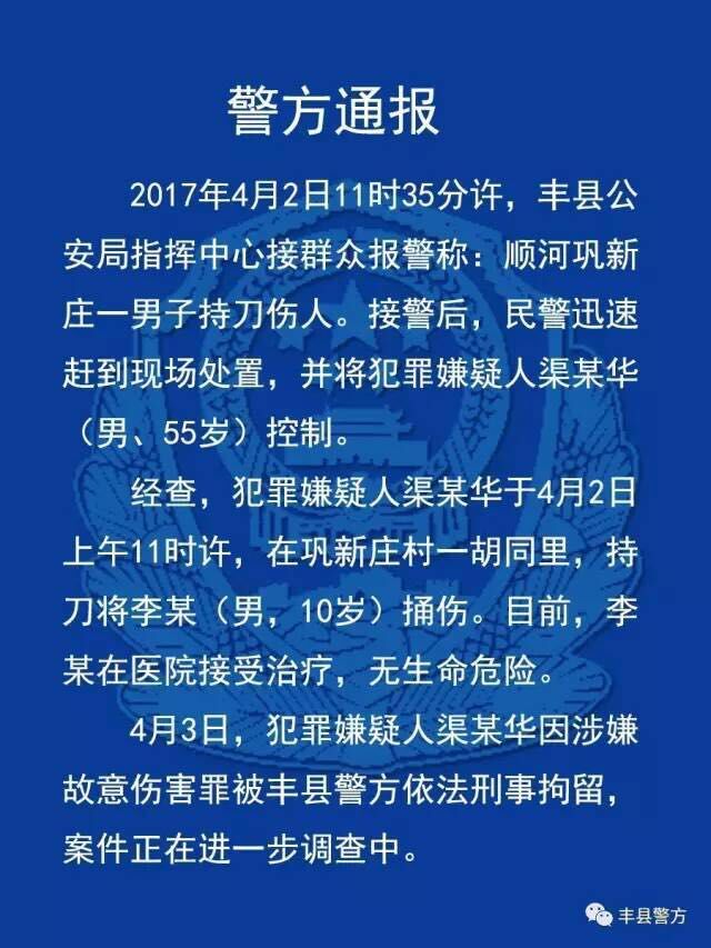 4月5日下午,当地警方发布通报称,经查,犯罪嫌疑人渠某(55岁)于4月2日上午11时许,在村子一胡同里,持刀将李某(男,10岁)捅伤。目前,李某在医院治疗,无生命危险。犯罪嫌疑人已被刑事拘留,案件正在进一步调查中。