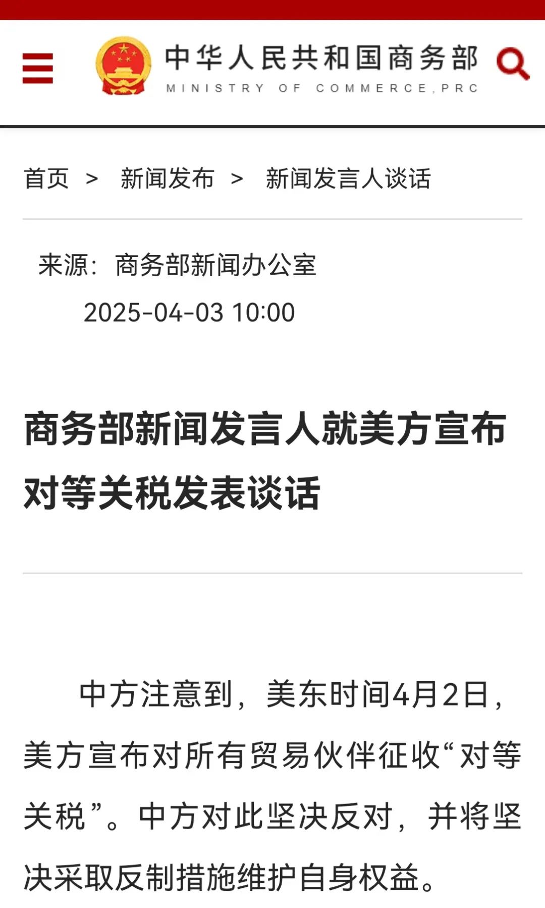 4月3日,中国商务部新闻发言人就美方宣布对等关税发表谈话指出,美东时间4月2日,美方宣布对所有贸易伙伴征收“对等关税”。中方对此坚决反对,并将坚决采取反制措施维护自身权益。