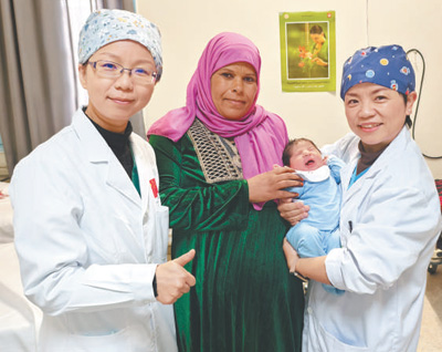 守护新生 中国第二十九批援突尼斯医疗队努力克服当地医疗药品设施短缺、医疗技术落后、生活环境艰苦等种种不利条件,积极开展义诊活动。截至今年3月,已累计诊疗超1万人次,赢得当地民众广泛赞誉。 图为中国第二十九批援突尼斯医疗队西迪分队队长俞颖慧(右)和麻醉师熊颖芬(左)与新生儿及其家人合影。 张 宁摄 |