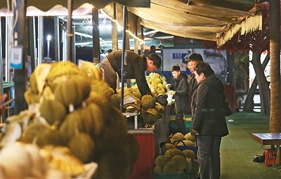 图为今年1月,在中国与东盟唯一海陆相连的边境口岸城市广西壮族自治区东兴市,游客在国门景区步行街内选购榴莲。 新华社记者 方 欣摄