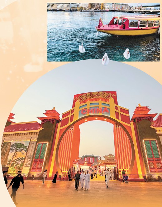 上图:瑞士日内瓦湖畔,华灯亮起,一艘正要起航的游船为这座城市增添了一抹流动的暖意。 本报欧洲中心分社 皮埃尔·福劳特摄 下图:阿联酋迪拜地球村于每年10月到次年4月下午4时至晚上12时运营,目前已发展成为拥有30个国家主题展馆,集美食、集市、娱乐设施和文化演出为一体的休闲目的地。图为迪拜地球村中国主题展馆。 本报中东中心分社 塔里克·易卜拉欣摄 |